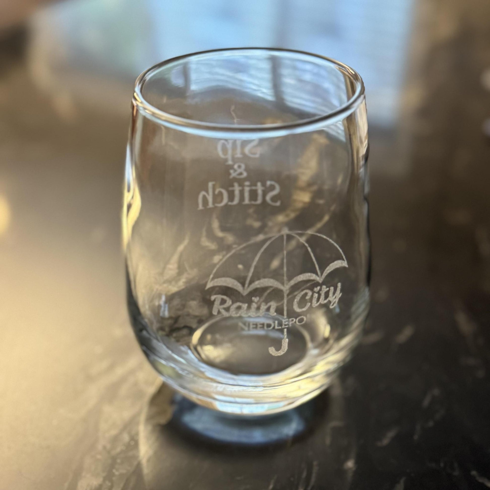 Stemless wine glass with our logo etched on one side and "Sip & Stitch" etched on the opposite side.